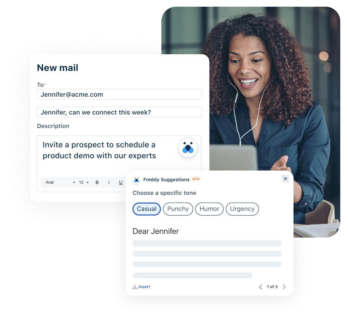 Get more done in less time with Freddy, your always-available AI assistant. Freddy helps you find potential customers, create personalized emails, and provides insights to help you close deals faster.